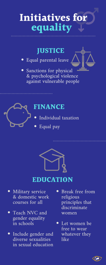 Some excellent ideas came from all participants, with legislative proposals on parental leave, sanctions for violent behaviour as well as improved financial equality. Much remains to be done in the field of education, which is the foundation of society. Here is a summary of the contributions.