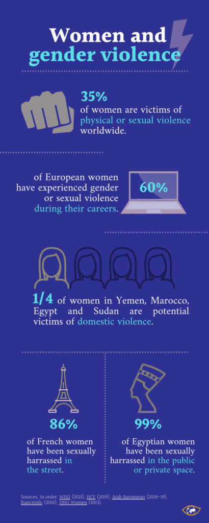 Sources, in order: WHO (2021), HCE (2019), Arab Barometer (2018-19), franceinfo (2018), ONU Women (2013).