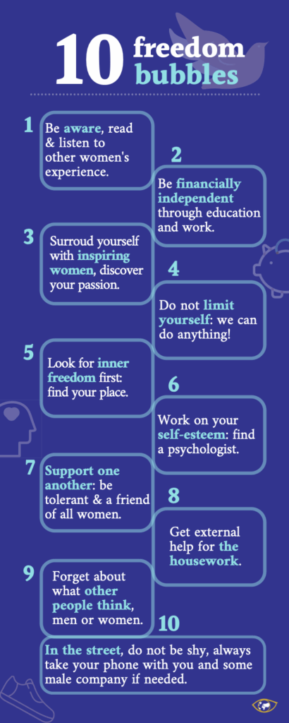 Fighting against millennia-old religious and cultural principles that are strongly intertwined, fighting against the very structure of both region’s deeply patriarchal society, fighting against one’s own brothers and partners… This is the price to pay for exercising one’s rights, eliminating violence and gaining real freedom. This battle will not be physical but social, educational and collective. It can be fought in several ways: below is some practical advice drawn from participants’ suggestions. This survey shows that by joining forces and resources, women are powerful and prepared to defend their rights. For them and for future generations.