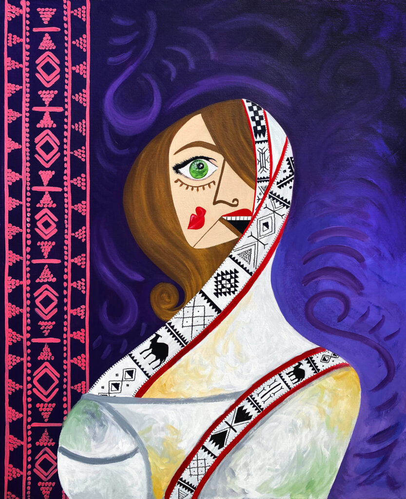 Purple is coming from the lavender colour of the flowers in the desert. The Sadu pattern is on both sides. That’s why I did the background of this painting in purple, to match that carpet.