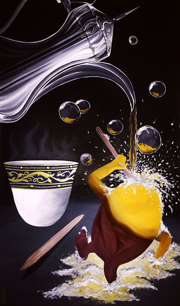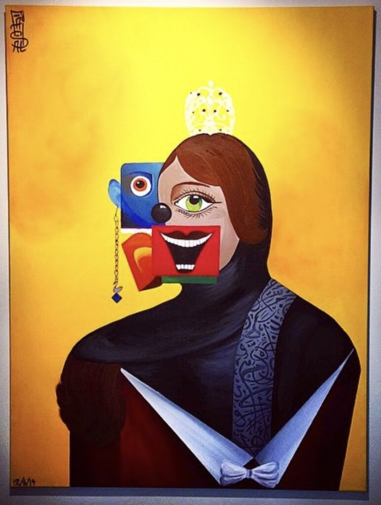 After some time, I thought: I want to stop copying and start painting something for myself. So I chose a Michael Godard painting, the one with the strawberry taking a shower with a champagne bottle. I did it with a coffee and date: it was a date having a coffee shower. Then I chose a George Condo painting, “The Queen”. I added some Arabic letters to her dress and that’s it! It was basic customisation of their work, trying to mix it with my culture, and that’s what got me into the cultural part.