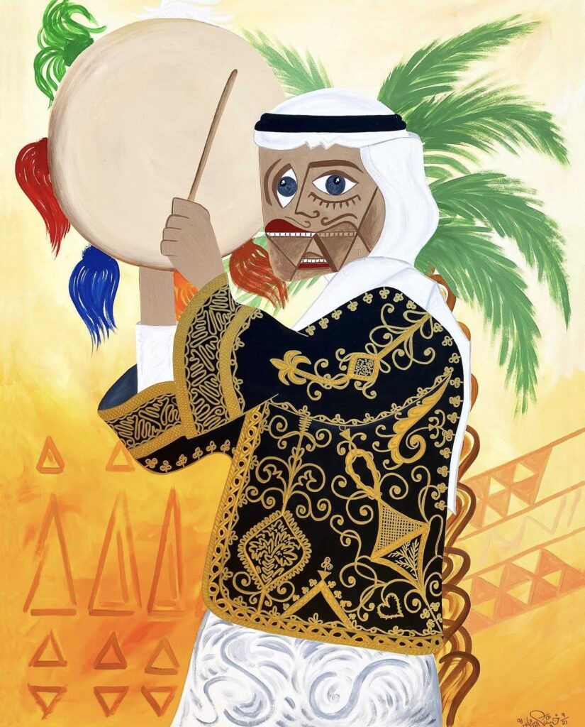 My recent paintings focus a lot on traditional outfits. Every region has a specific pattern. Cultural habits like the “kashta” (camping in a tent), or playing “oud” for example, music or food. I have only covered the tip of the iceberg!