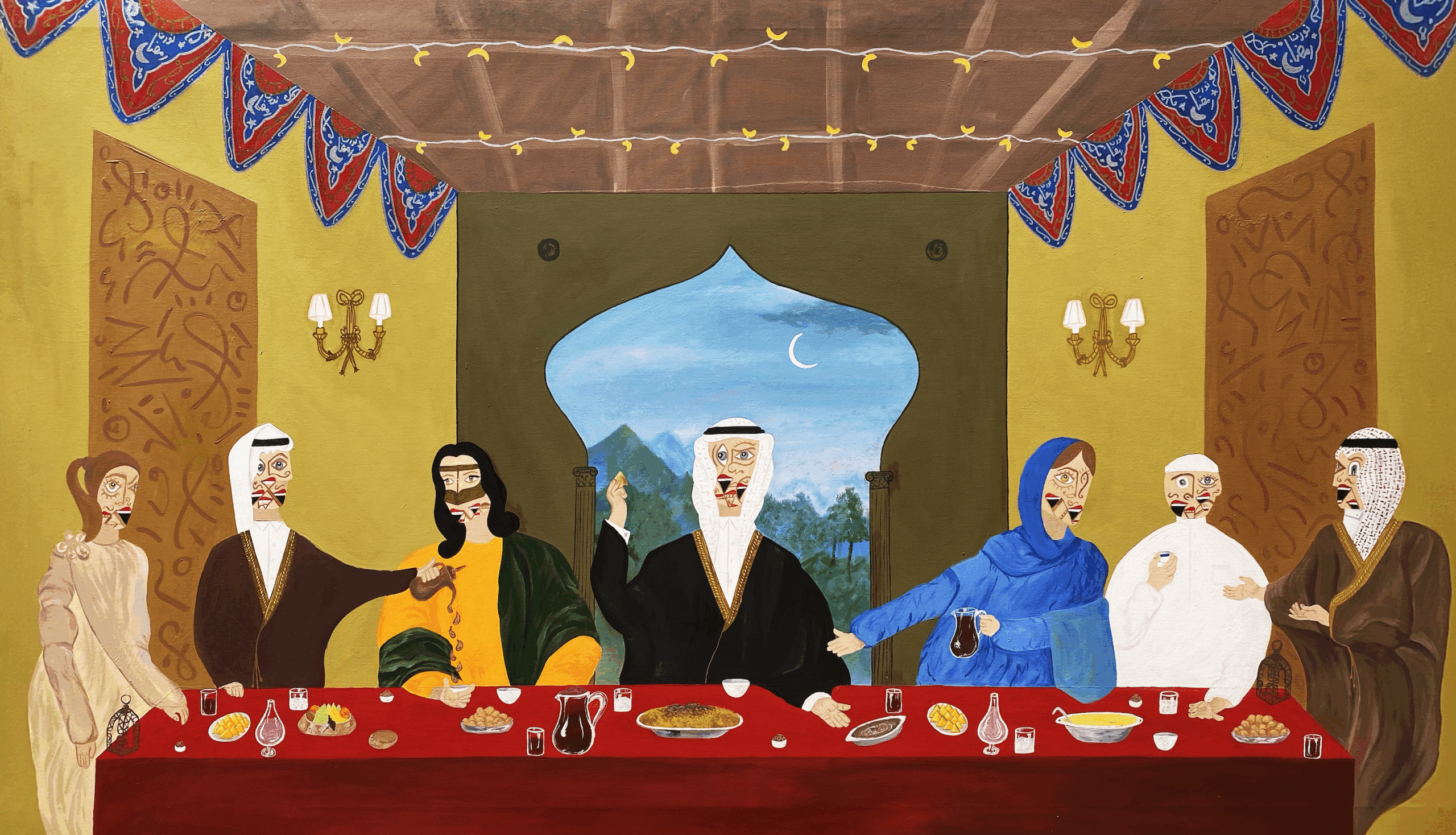 It depicts the same kind of setting, but set during first day of Ramadan, which is the holy month where Muslims fast from dawn till sunset, where all the family usually gathers to have breakfast. Even in the painting, you can find the Ramadan traditional patterns on the walls. The background shows the moon, meaning that Ramadan is here, and the table has all the Ramadan famous dishes that are only cooked during that time.”