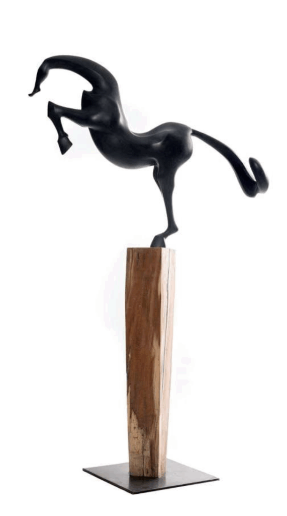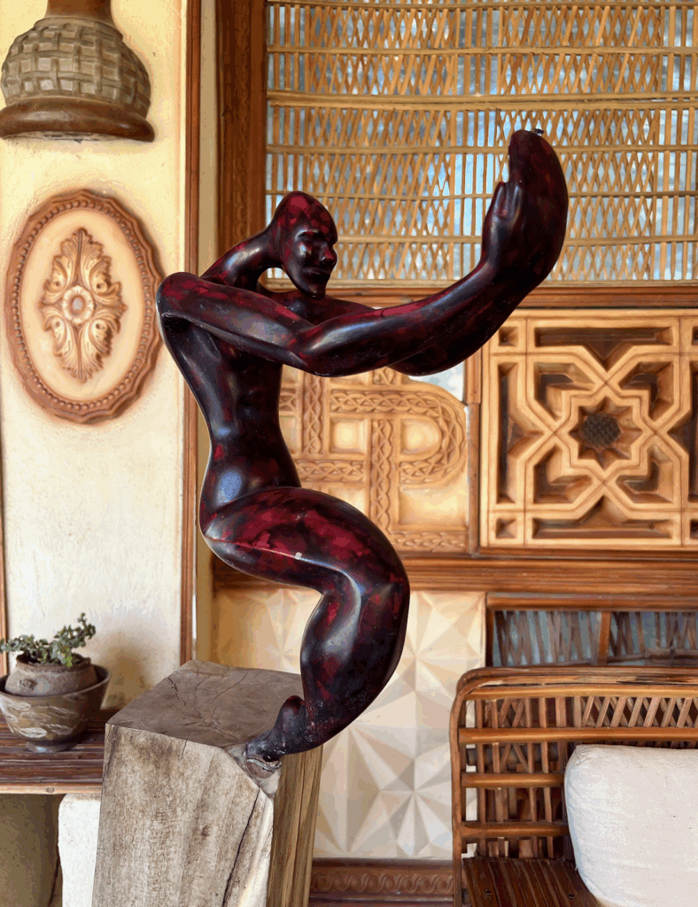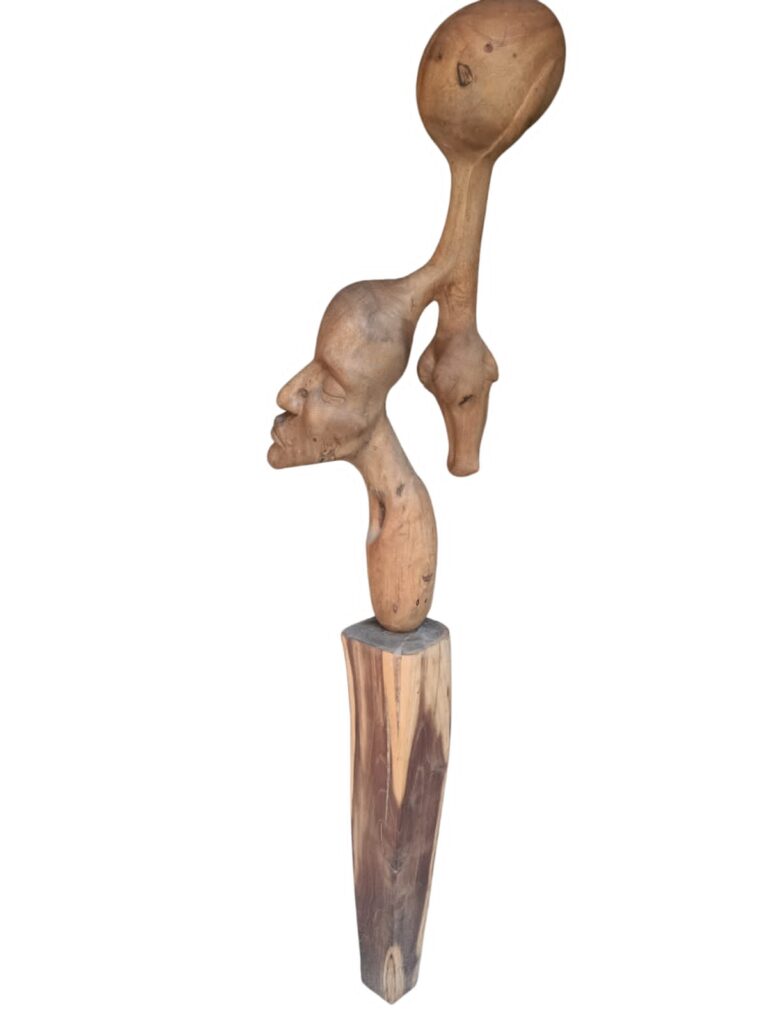 That moment formed the piece as a combination of raw confrontation with instinct and aggression. He carved it in sycamore fig, the same wood used in ancient Egyptian statues and coffins.