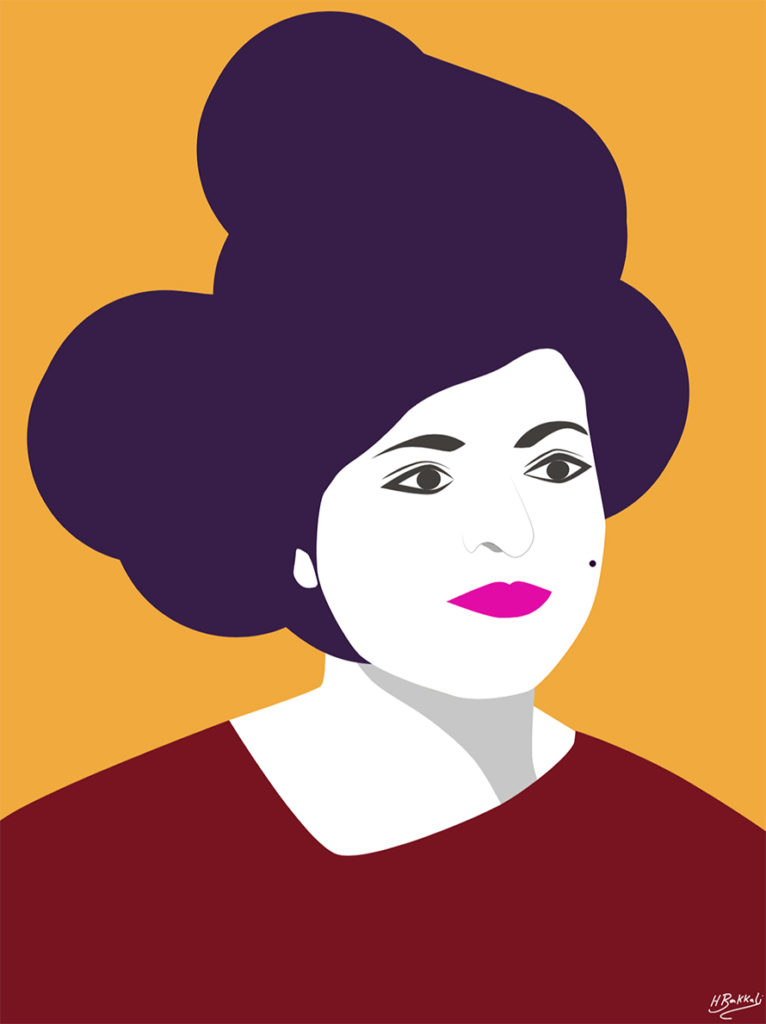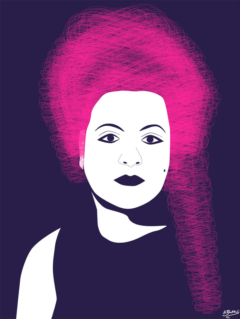 Elle met en scène la figure féminine africaine et arabe : une figure forte qui dans l’anonymat le plus total, lutte pour la liberté, la justice et sa place dans la société. Par des lignes simples et des couleurs vives, elle cherche à attirer l’attention sur l’opposition entre la simplicité et la force de son personnage.