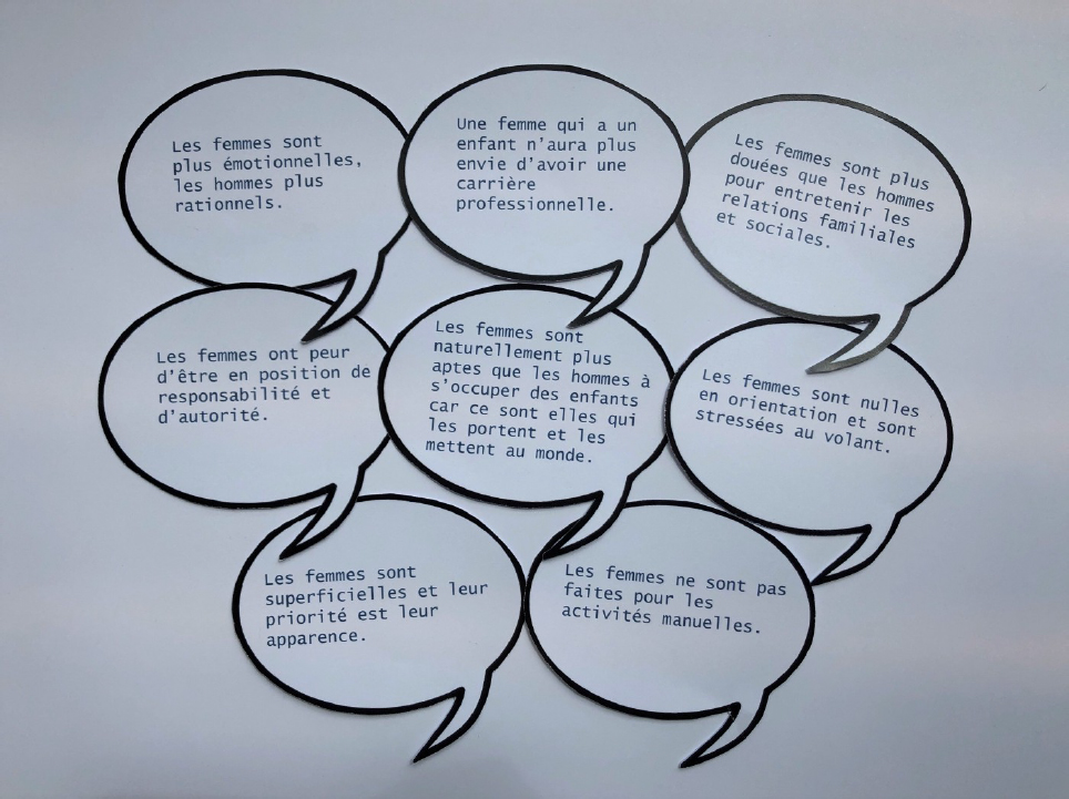 Les stéréotypes de genre impactent et limitent directement les aspirations et ambitions des filles. En l’absence de modèles de référence féminins, l’ordre social connu se perpétue. Malgré le fait que les filles obtiennent de meilleurs résultats scolaires, elles s’auto-excluent de certaines professions, par sous représentation de leur genre, manque de mobilité ou de flexibilité, ou déficit de confiance en elles. Ainsi, certains secteurs concentrent une majorité de femmes, souvent les moins valorisés (services à la personne, social, enseignement), tandis que les hommes occupent davantage des postes techniques et de direction (construction, gestion, police).