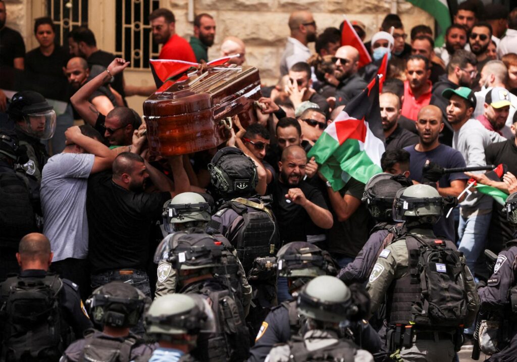 There was a burst of violence at her funeral on 13 May. As thousands of Palestinians were gathered in East Jerusalem – a predominantly Arab neighbourhood –, to pay their respects, the Israeli riot police assaulted a group of mourners carrying the coffin containing Sherine Abu Aqleh’s body. They fired tear gas as people tried to carry her coffin outside the hospital’s morgue, causing them to almost drop it. Israel had requested to limit the size of the funeral procession and that no Palestinian flags should be displayed and no slogans chanted. This warning proved difficult to heed given the outpouring of grief and anger over the killing. The police intervention drew shock and condemnation worldwide.